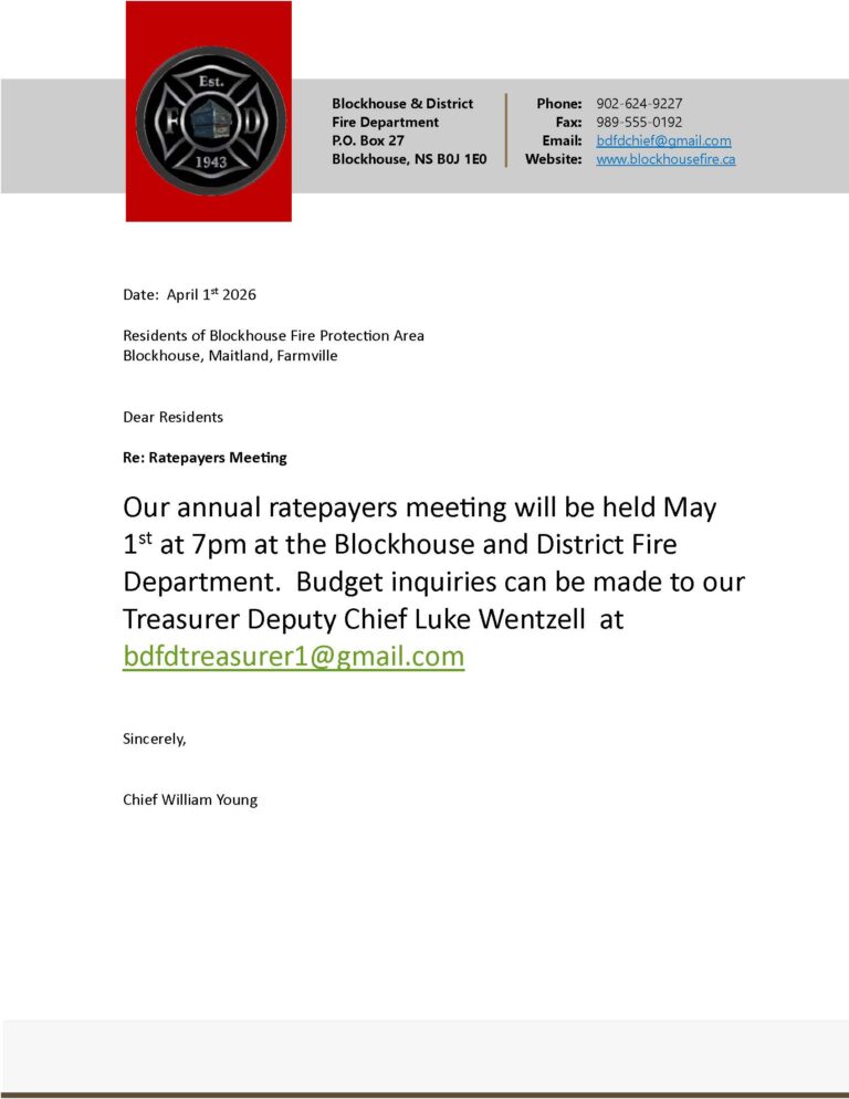 Welcome to the official website of Blockhouse & District Fire Department. Here you’ll find important information about our services, safety tips, and the brave firefighters who serve to keep you safe. Thank you for trusting us to safeguard your home, business and loved ones. Together, we can make our community stronger, safer, and more resilient. Stay safe, stay informed.